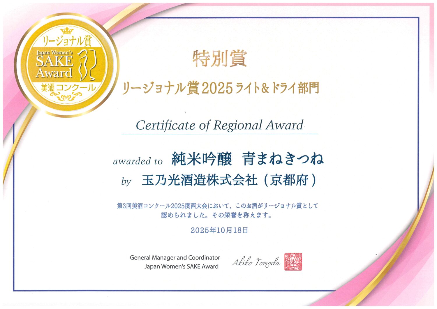 【受賞情報】「第3回 美酒コンクール2025関西大会」金賞受賞に続き、特別賞「リージョナル賞」受賞!